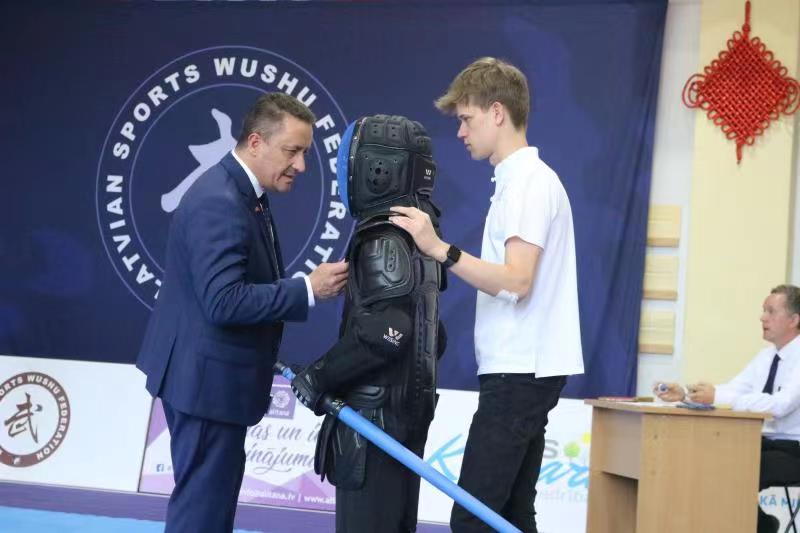 At the opening ceremony, distinguished guests from Latvia and China gathered together on this significant occasion. Among them were President Roman Vlacenko, CFO Viktorija Vlacenko and Secretary General Jana Kosenko from Latvian Sports Wushu Federation; Ambassador Mr. Tang Songgen, Minister Counselor Ms. Song Danhui, Secretary Mr. Hou Tete, Mr. Wang Yuejin, and Mr. Cai Wenzhen from the Chinese Embassy in Latvia; Director Ms. Wang Nan, Secretary Ms. Yao Yizhou and Mr. Zhao Guodong from China Cultural Center in Riga; Director Mr. Shang Quanyu and martial arts volunteer Ms. Zhong Mengting from Confucius Institute at University of Latvia; Vice President Mr. Xia Xiaolei from Latvian Chinese Association; Mr. Guo Qun and Ms. Li Deping from Riga bureau of the Xinhua News Agency. Together, they witnessed the splendid opening of the competition.