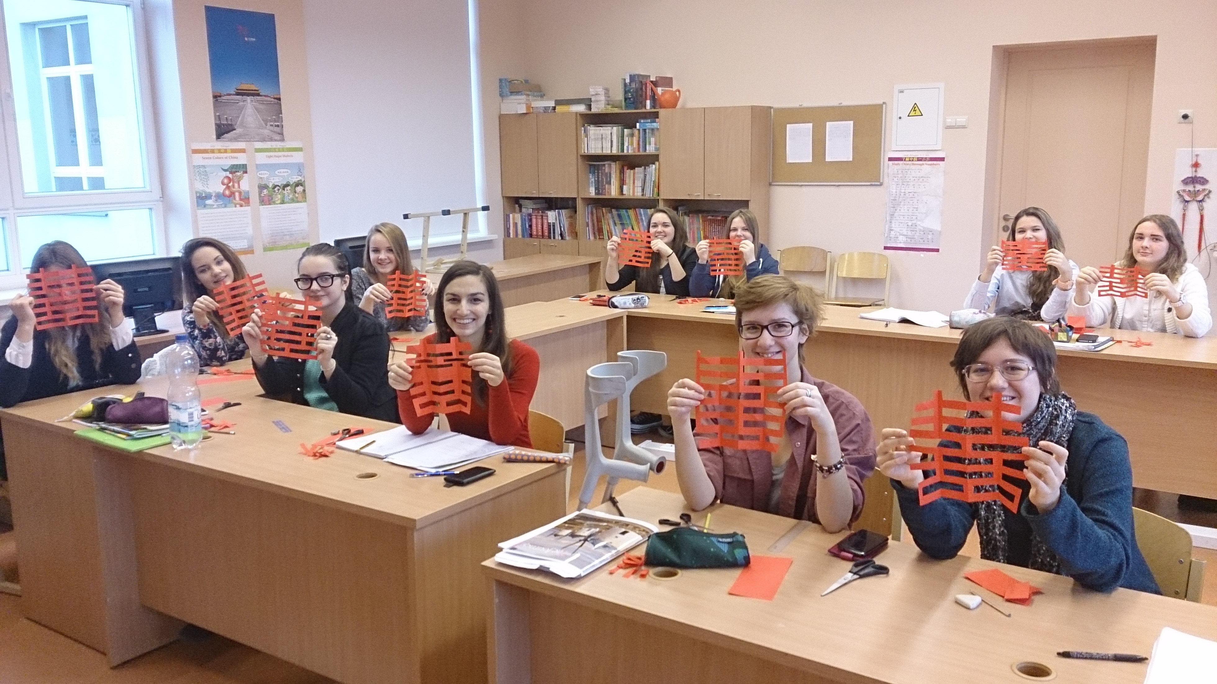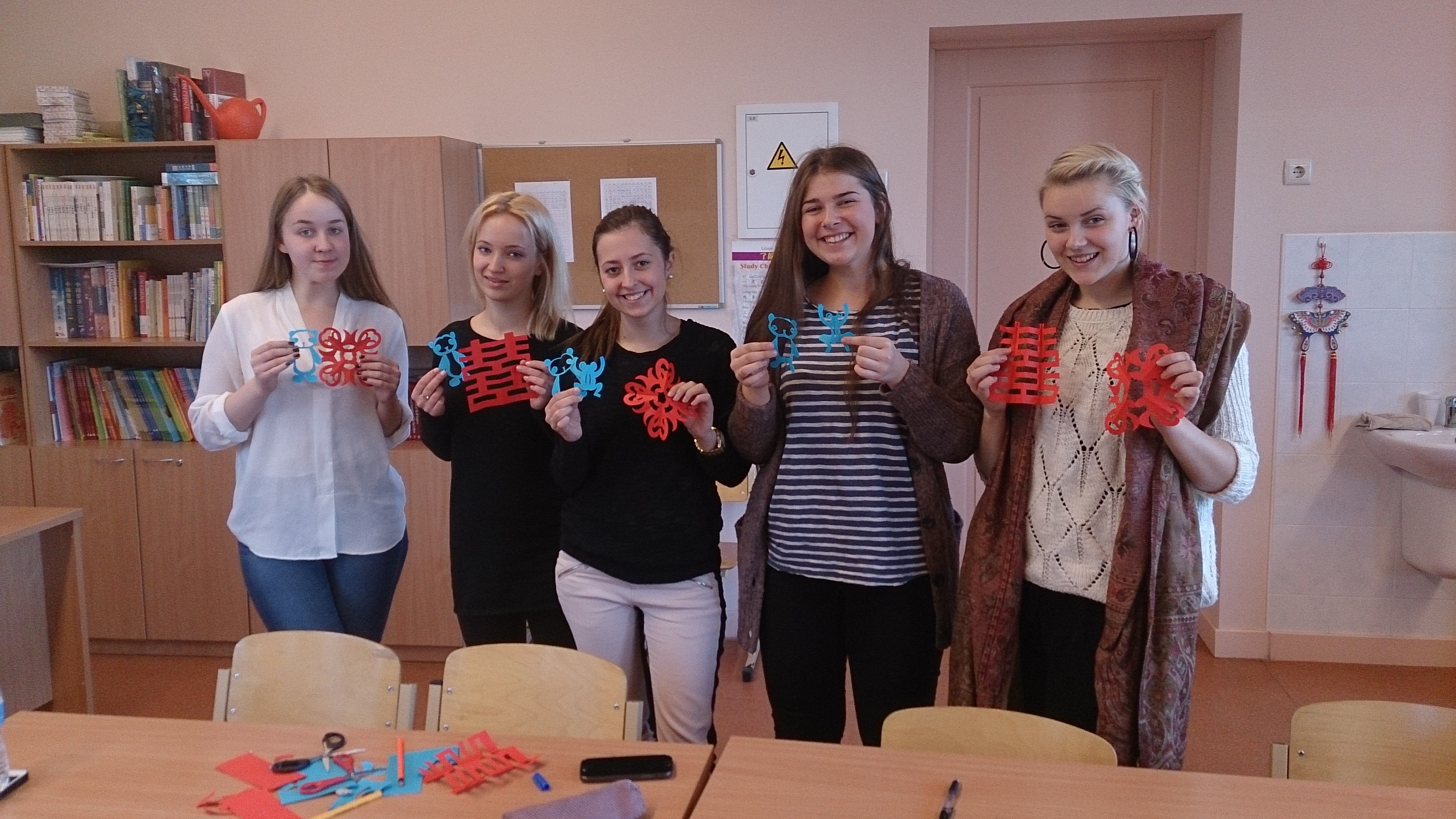 在充满浓浓中国味的教室中,学生们的剪刀上下翩飞,一个个美丽的窗花,憨态可掬的熊猫逐渐显出了面目——这是里加文化中学孔子课堂文化周的汉语课。