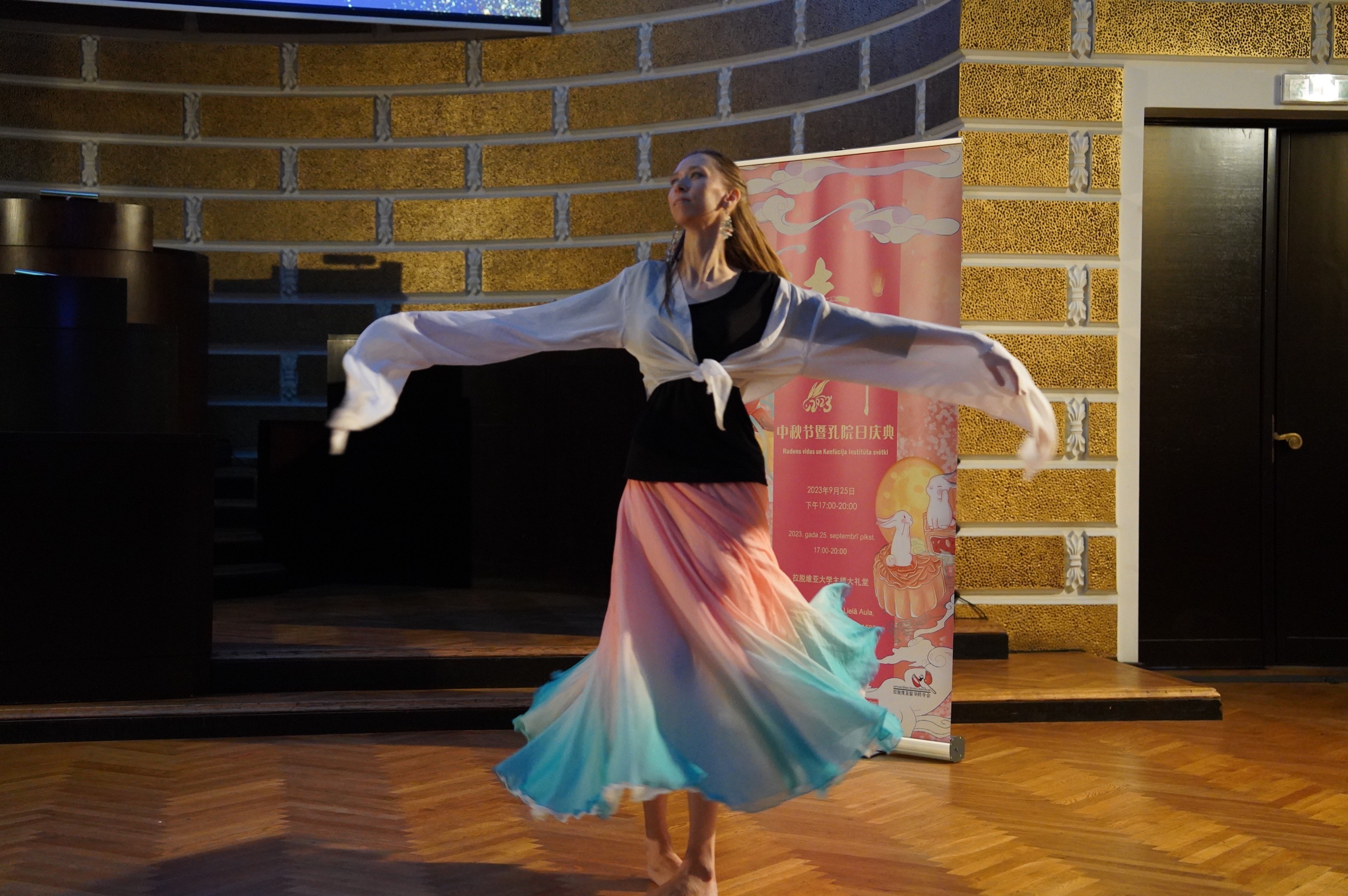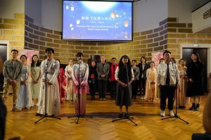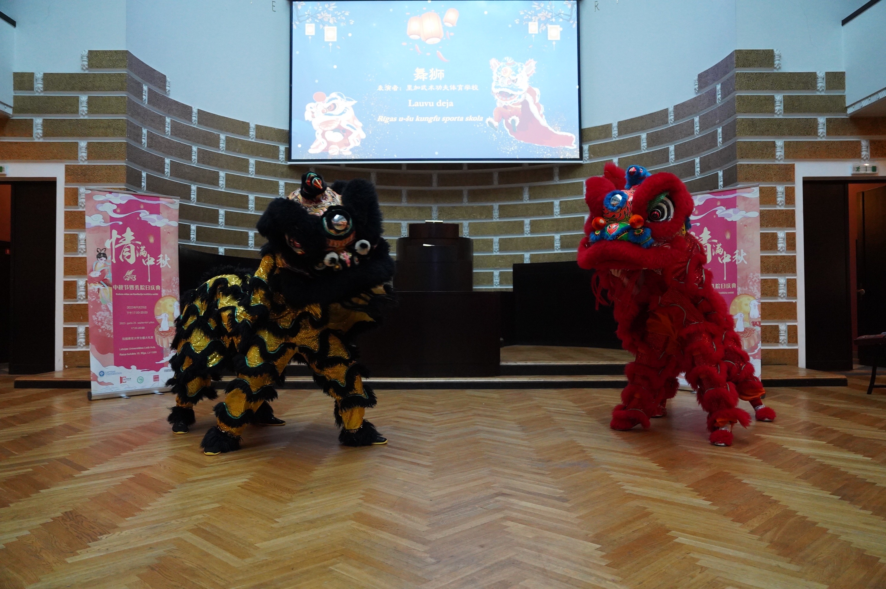 The performances that followed pushed the atmosphere of the scene to a climax. There are various forms of performances, including martial arts, dances, songs, guzheng and clarinet. The lion dance and martial arts performance quickly ignited the atmosphere of the scene; Professor He Dong and local Chinese teacher Madara Smalka sang a beautiful song “Why Are the Flowers So Red”, which was full of exotic style; the dance “Drunk” presented by Zaoxing and Xiaodi, students of the Confucius Institute at the University of Latvia, made the audience intoxicated as if they had witnessed the Chang’e fairy dancing before them. In addition, representatives of international students and the Xin Yue Choir performed the beautiful Chinese song “Friends” and Latvian songs “Tu saviļņoji mani”. It is worth mentioning that Marija and her father performed the Chinese song and dance of “I Wish to Be a Lotus in the Next Life”, which was touching. Finally, the celebration ended successfully with the singing of “May Our Life be Long”.