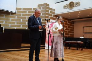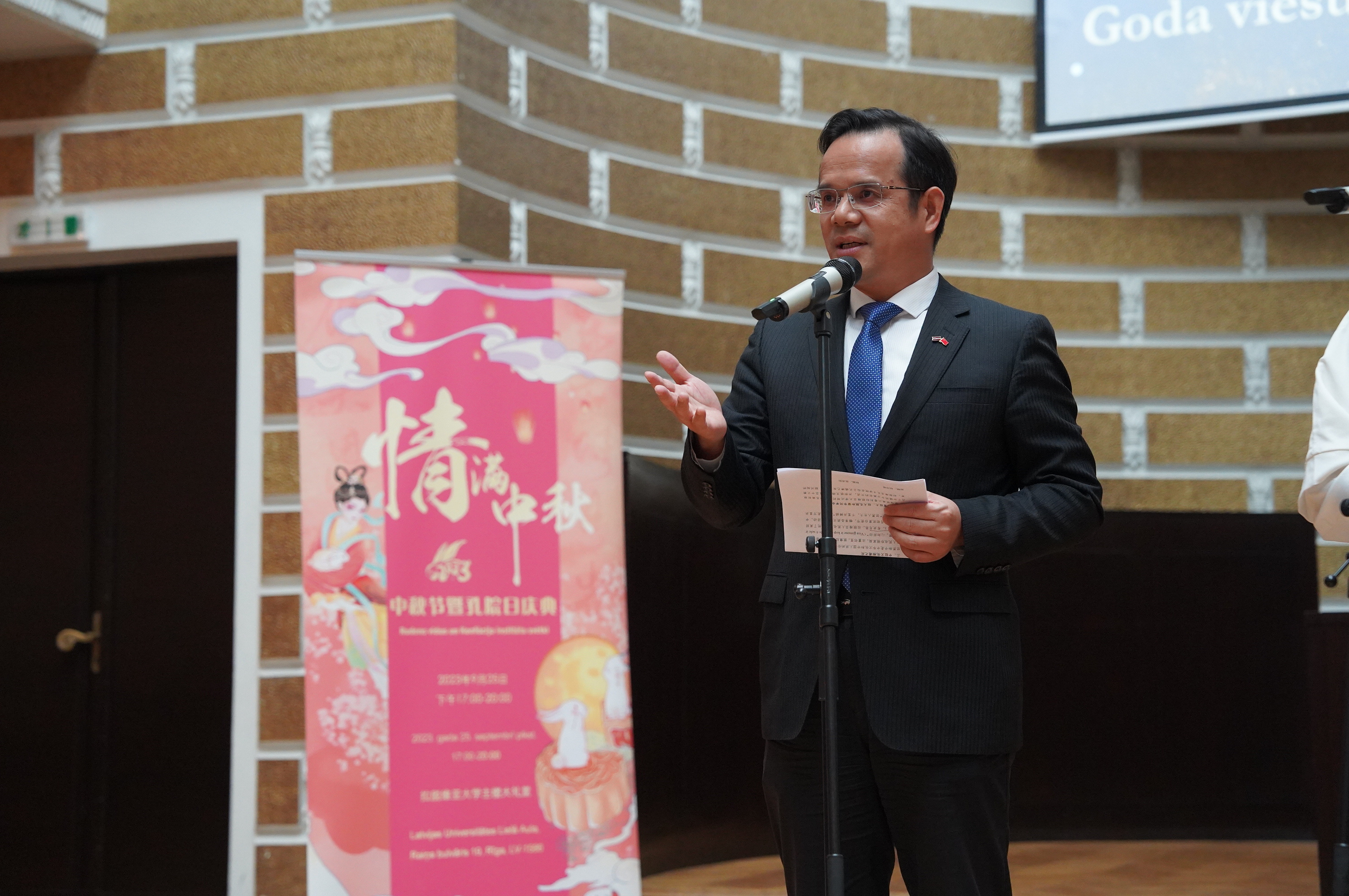 In the opening speech, Professor Pēteris Pildegovičs and Professor Shang Quanyu expressed a warm welcome to everyone present and emphasized the importance of the golden autumn month for the Confucius Institute at the University of Latvia: the beginning of the new semester, the anniversary of the University of Latvia, the Mid-Autumn Festival and the Confucius Institute Day. Finally, the two directors hoped that every Confucius Institute member’s dream will come true, and appreciated everyone for their long-term support to the Confucius Institute at the University of Latvia and looked forward to continuing to create new situations and create new glories together. Mr. Tang Songgen, Ambassador of the Chinese Embassy in Latvia, stated in his speech that in March of this year, Chinese President Xi Jinping proposed the Global Civilization Initiative for the first time and was committed to realizing exchanges and dialogue among different civilizations. He also affirmed that this event is a powerful manifestation of the implementation of the Global Civilization Initiative. Then, the Vice Principal Valdis Segliņš delivered a speech. He briefly introduced the customs and legends of the Mid-Autumn Festival to everyone, and called on everyone to actively learn Chinese and Chinese culture.