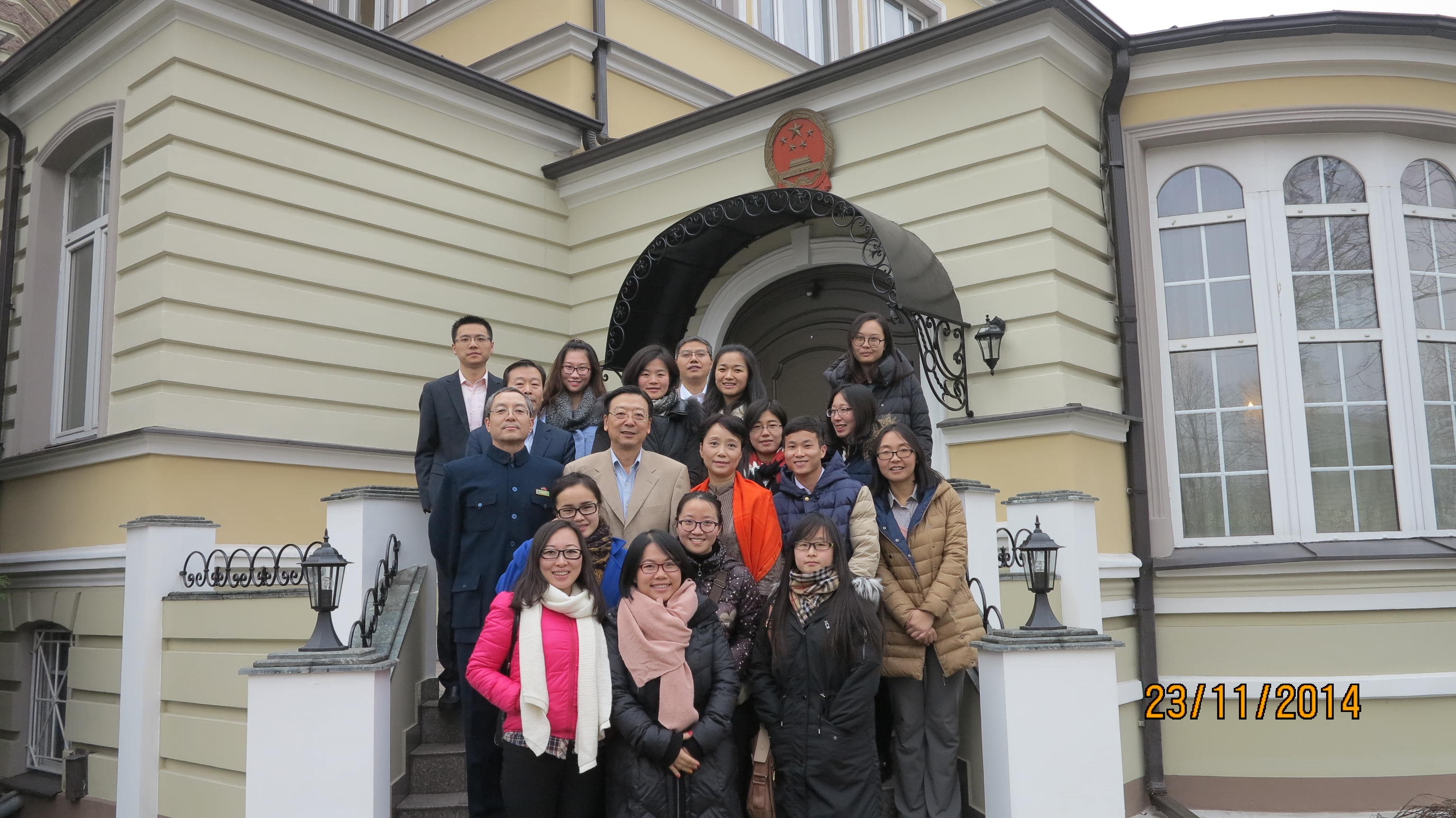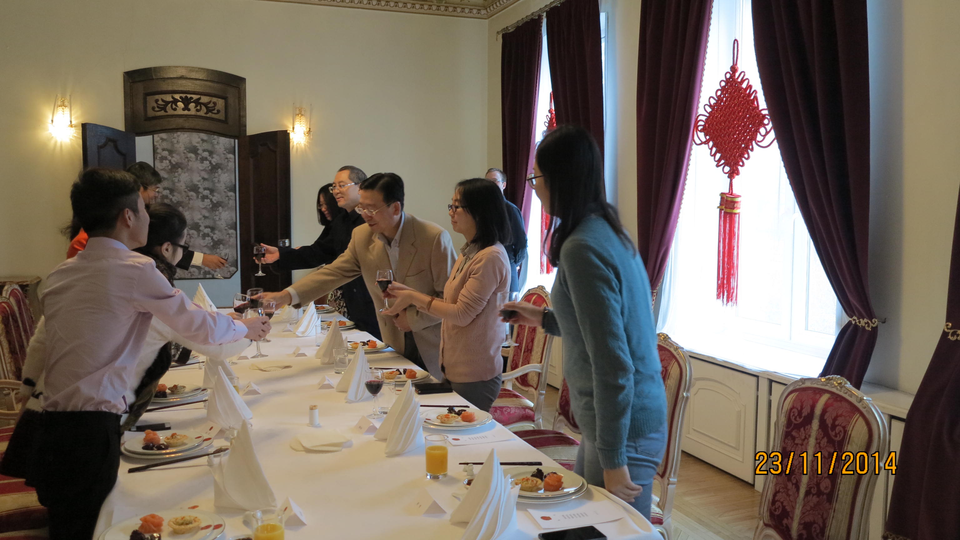 2014年11月23日中午,中国驻拉脱维亚大使杨国强在大使馆设宴,慰问在拉脱维亚辛勤工作的全体汉语教师。拉脱维亚大使杨国强先生及其夫人,政务参赞傅智敏先生,领事曾伏华先生,拉脱维亚孔子学院中方院长尚劝余教授出席了本次餐会,除此之外,来自拉脱维亚孔子学院、拉脱维亚大学人文学院、里加理工大学、里加文化中学、道加瓦皮尔斯大学、雷泽克内大学、维泽梅大学、斯密尔提恩中学的汉语教师与使馆工作人员齐聚一堂,共襄盛举。