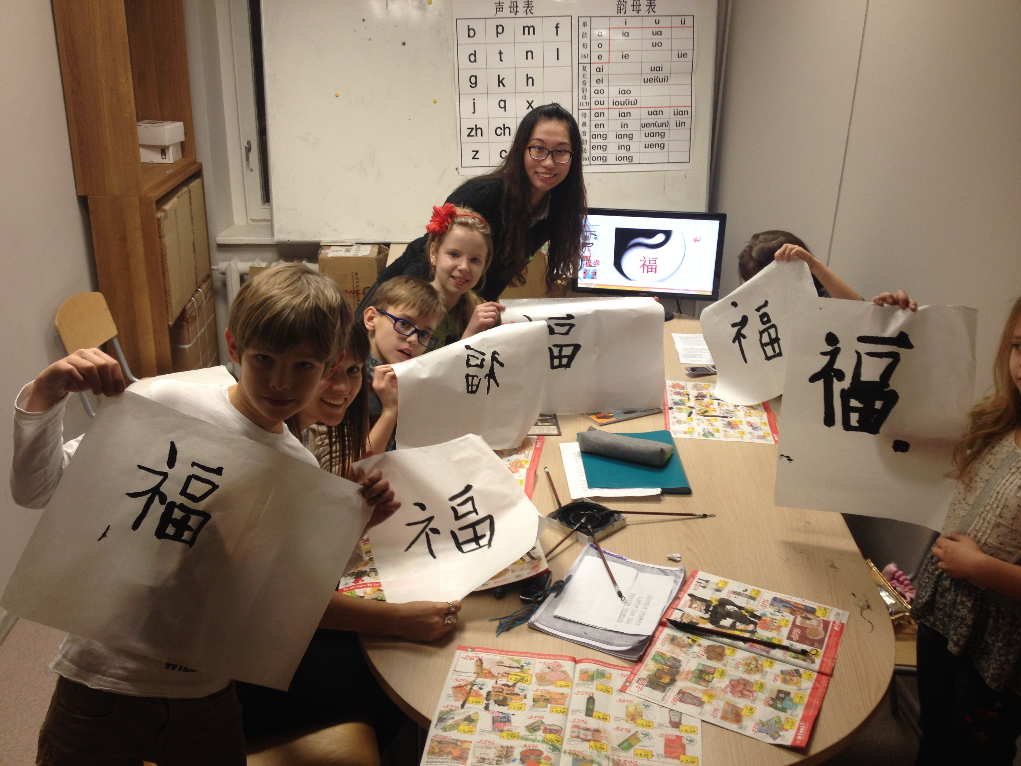 随后,记者观摩了高级二班的古汉字课堂。高级二班教师张婕向大家讲解了古汉字背后的故事和文化内涵,并展示了汉字从古至今的演变过程。一个个像画一样的古汉字仿佛拥有生命一般,吸引着众人的眼球。接着,记者来到了少儿班的课堂,打开门,一股墨香扑鼻而来。原来,少儿班正在进行中国书法的教学。只见孩子们有模有样地拿着毛笔,认真聆听教师的讲解。记者见状也参与其中,不出一会儿,一个个“福”字跃然纸上。课后,记者采访了这群可爱的孩子们,孩子们纷纷表示学习汉语很有乐趣,他们最喜欢学唱汉语歌和做汉语游戏,并当场合唱了一首汉语歌。